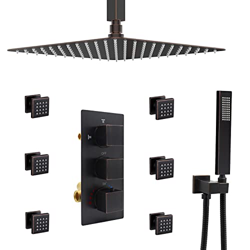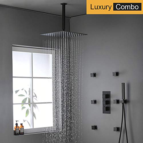 [ ALL METAL SHOWER FULL SET ] - Thermostatic brass shower system with body spray jets, 16" ceiling rain shower faucet and handheld combo set, complete bathroom shower kit comes with rain mixer valve trim. Constructed from solid brass and SS 304 stainless steel, avoid rust and leak, ensuring longivity and durability.