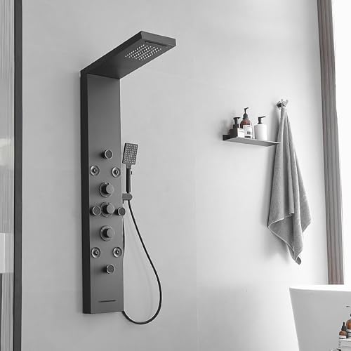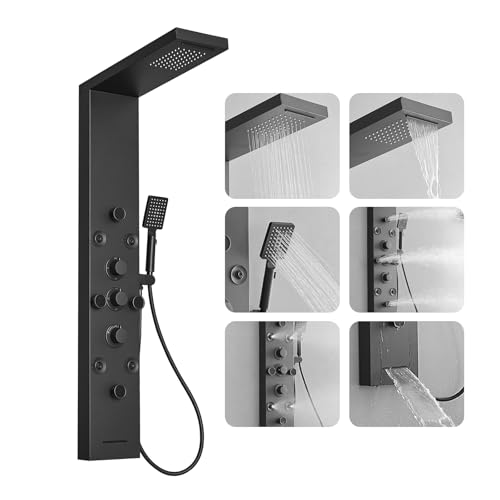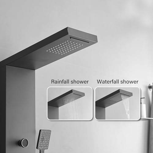 ?Multi-Function Shower System?The shower panel including rainfall and waterfall shower head,3 different body massage spray jets,3 functions handheld shower head and tub spout.large shower head can covers you without turning around;body massage spray jets and handheld shower can wash away a day's fatigue and get you relaxed,tub spout can quickly fill your tub with water.