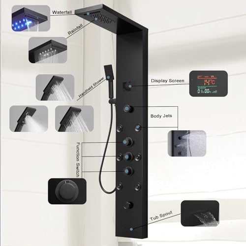?Multi-Function Shower System?The shower panel including rainfall waterfall shower head,2 different body massage spray jets,3 functions handheld shower head and tub spout.large shower head can covers you without turning around;body massage spray jets and handheld shower can wash away a day's fatigue and get you relaxed,tub spout can quickly fill your tub with water