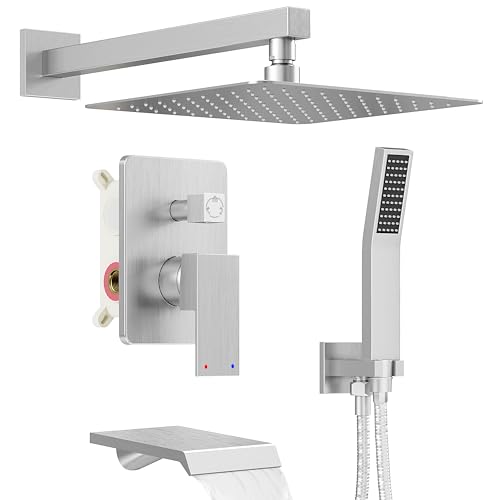 HomGoo Shower System with Tub Spout, All Metal Tub Shower Faucet Set with 10'' Rain shower heads and handheld spray combo,Wall Mounted Tub Shower Systems with Valve and Trim Kit, Brushed Nickel