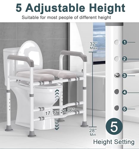 ?5-Levels Height Adjustable?: Raised toilet seat for seniors features adjustable height, with the seat height ranging from 17" to 23" from the ground and the armrest height ranging from 28" to 32" from the ground, toilet seat riser with handles perfect for minimizing knee strain and providing a custom fit for every user