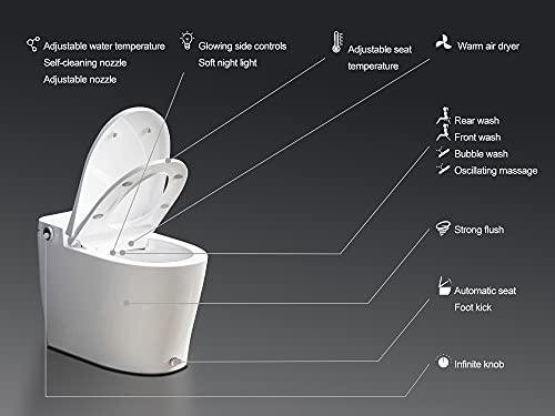 ?Integrated Toilet? The perfect combination of toilet and bidet, you can easily enjoy the seat heating, warm water bubble wash, and warm air drying. Automatic or foot kick to open and close lid, automatic flushing after leaving, realize hands-free operation.