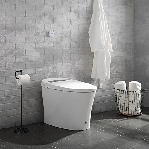 Dual-flush with high-performance Vortex 1.1 / 1.6 gallons per flush (GPF) Touchless Technology Powered By 4 AA Batteries & 3 AAA Batteries (not included) Includes off-seat flushing, a foot-touch flush, and hand-waved flushing Durable Ceramic Material Soft-Close Toilet Seat Elongated bowl offers added room and comfort Included: Sealing flange, inlet hose, install kit, angle valve and wall sensor