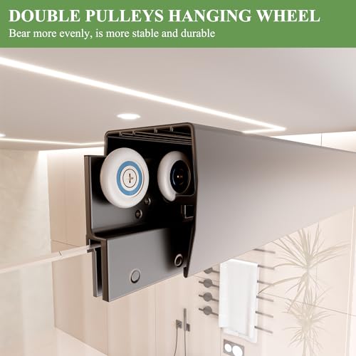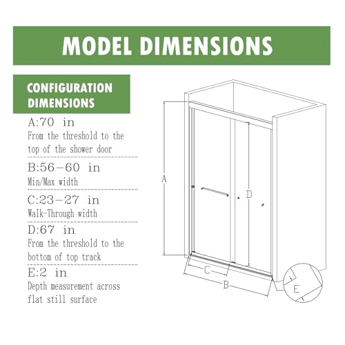 ?Double Bypass Sliding ?The glass shower door is equipped with double pulley hanging rollers which make the sliding smoother and quieter. The door can be adjusted to 56 and 60 in width by cutting, maximizing your bathroom layout.