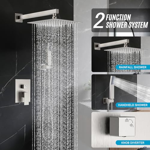 Includes: 10-inch square fixed shower head, handheld shower head, shower arm rod, shower hose, shower base, and shower faucet rough-in valve body.