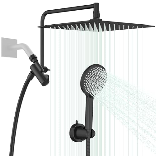10'' High Pressure Shower Heads: 10 Inch large shower head, provides waterfall full body coverage and rinse the foam quickly even in low water pressure areas. Ultra-thin square waterfall showerhead made from 304 stainless steel, rust resistance and deformation. 360° rotation black shower head with brass ball joint, reduce the risk of cracking and leaking.