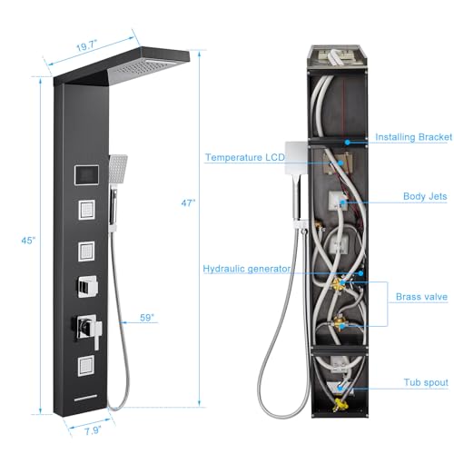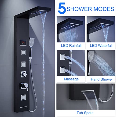 ?5 IN 1 Shower Panel?Luxury shower panel has built-in LED overhead rainfall waterfall showerhead, a multi-function handheld shower wand, rain massage and mist massage. Hydroelectricity Temperature display that assist you to select the best water temperature