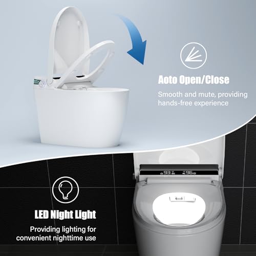 ?Smart Bidet Toilet?Upgrade your bathroom experience with our smart bidet toilet. Designed for ultimate comfort and convenience, it features auto flushing, heated seat, warm air dryer, pre-wetting, instant warm water for a refreshing, hygienic experience. The toilet also includes a night light, an display screen, and comes with a remote control for easy operation.