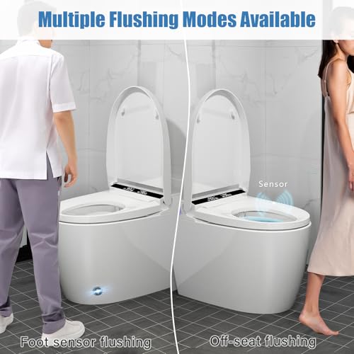 ?Intelligent Control?This smart toilet has an automatic lid, which opens automatically upon you approach, and closes with a flush as you depart. It offers multiple flushing modes, including remote control, foot sensor, knob, and manual flushing during power outages. Enjoy convenience, cleanliness, and comfort for an enhanced bathroom experience.