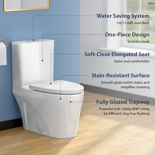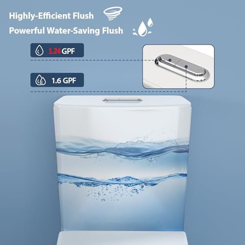 Siphon Flushing System with self-cleaning glaze : This innovative siphonic vortex flushing system combines powerful cleaning with multiple user-friendly benefits. The 360° circular water curtain scrubs the glaze for self-cleaning and hygiene maintenance, reducing manual scrubbing. Its negative-pressure suction removes waste to prevent clogs, while the Toilet Wax Ring blocks odors and splashes for enhanced comfort. The dual-flush toilet mode saves 30% more water than standard toilets and offers 1.24/1.6 GPF options. The low-pressure quiet design avoids disturbing others at night.
