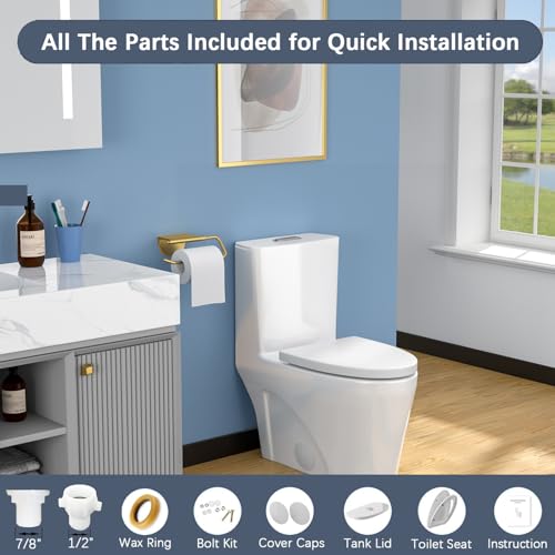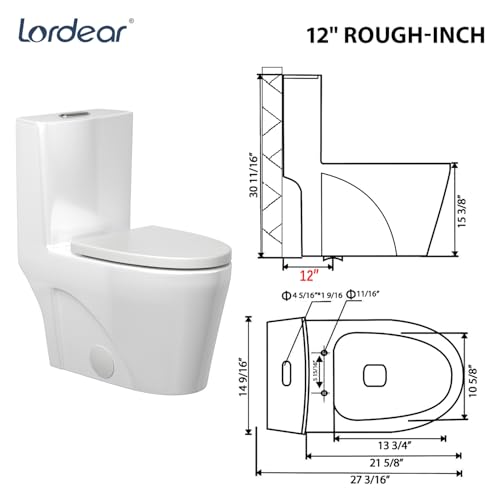 Compact One Piece Toilet: This Lordear one piece toilet boasts a seamless, minimalist design that enhances any bathroom aesthetic. With a standard 12 inch rough in and compact elongated dimensions (14-9/16" W x 27-3/16" D x 30-11/16" H), it optimizes floor space while maintaining full functionality—ideal for both powder rooms and main bathrooms where space is at a premium. The rear contains a pipeline adapter. If your interface is 7/8", please remove the 1/2" adapter for use; If your interface is 1/2", please install and use it directly.