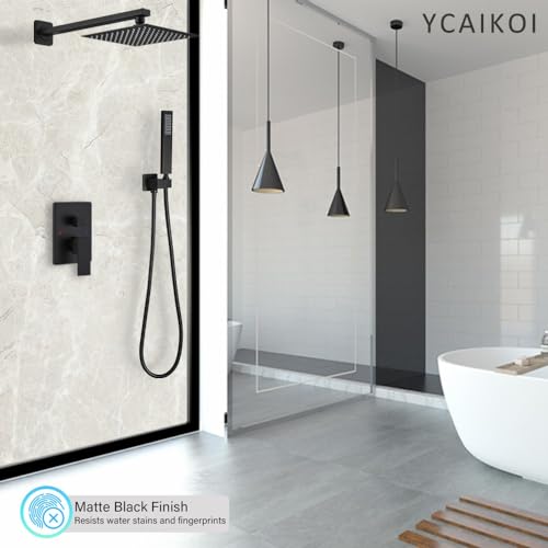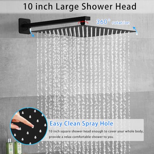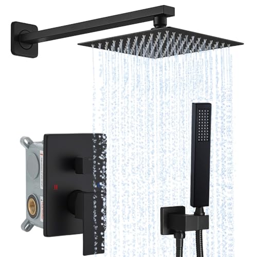 Shower Faucet Sets Complete: 10 inches Square rain shower head (304 stainless steel), handheld shower head (Brass), 13.7 inches shower arm (304 stainless steel), 59 inches shower hose (304 stainless steel), shower holder (Brass), shower mixer control valve (Brass)