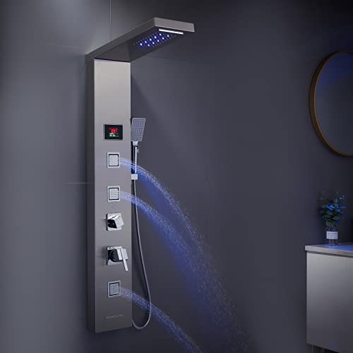 ?5 IN 1 Shower Panel?This LED lights shower tower system features rainfall waterfall shower head, 3 body jets, 3 setting handheld shower, waterfall tub spout and water temperature display, a completer shower column system.