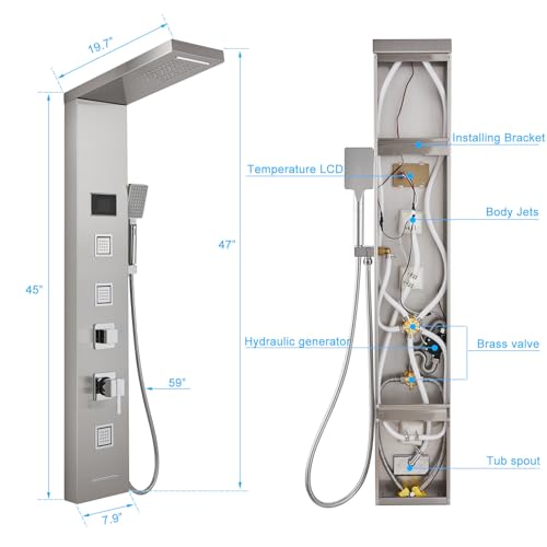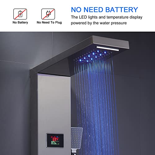 ?Upgrade design?This Shower Panel System comes with LED lights & Temperature display. And there is no need for additional power connection, also no troublesome battery replacement, The LED lights and Temperature display powered by the water pressure.