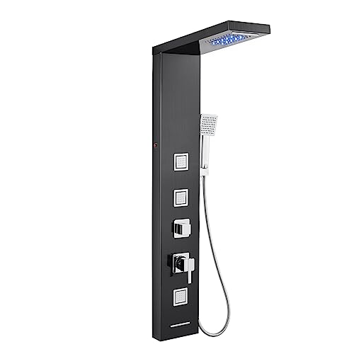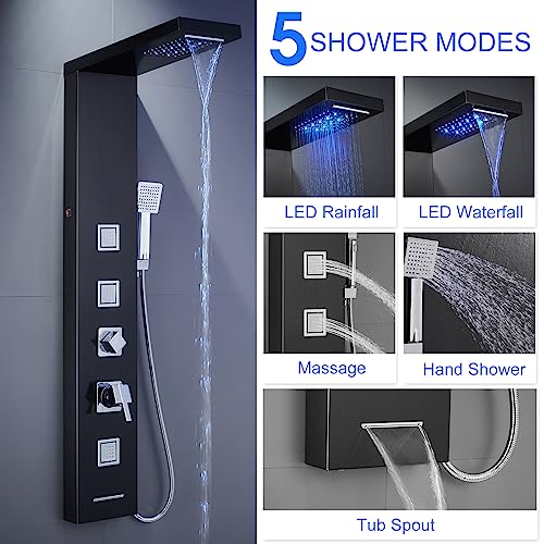?5 IN 1 Shower Panels?Come with five comfortable shower modes: waterfall, rainfall, 3 massage jet, hand-held shower head, and tub spout. Rubber nozzles spraying soft mist or strong water to massage your body is non-clogging and maintenance-free. The shower head is also fit for pet washing or room cleaning