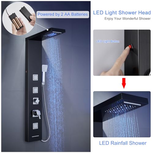 ?LED Shower Head?Turn on the led lights by pressing the red switch at the left side of the shower panel, led lights powered by 2 AA batteries(No batteries included)