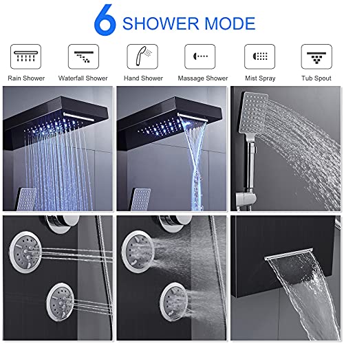 ?6 Shower Modes?This Shower Panels Comes with Waterfall, Rainfall, Massage Jets, Mist Spray, Tub spout, Handheld shower. Note: If your water pressure is strong enough, you can turn on both modes at the same time.
