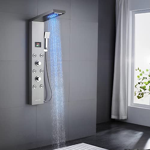 ?Hydropower design?This Shower Panel comes with LED lights & Temperature display. And there is no need for additional power connection, also no troublesome battery replacement, The LED lights and Temperature display powered by the water pressure.