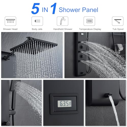?Multi Function Shower Panel System?This shower panel meets all your bathing needs: Height adjustable shower head, 6 pcs body jets,Waterfall tub Spout, Handheld shower and temperature display, that assist you to select the best water temperature. All functions can only be used individually to ensure sufficient water pressure.