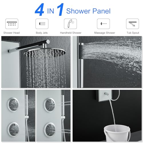?State-of-the-Art Design?-The MENATT White Glass Shower Panel Tower System features an elegant white Tempered Glass overlay combined with a durable 304 stainless steel frame, 6mm tempered tough glass surface minimizes water spots and allows for easy cleaning, This high-quality construction ensures long-lasting durability and resistance to corrosion, making it an ideal choice for long-term use.