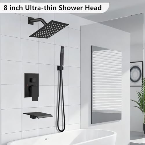 ?Special Feature?: 8" large square showerhead, Large water pressure makes the shower very pleasant. It looks like standing in the nature and enjoying the feeling of rain stroking.The waterfall is perfect as well.Our shower valve comes with built-in diverter. Ceramic disc diverter valve provides smooth and easy function-switching operations.