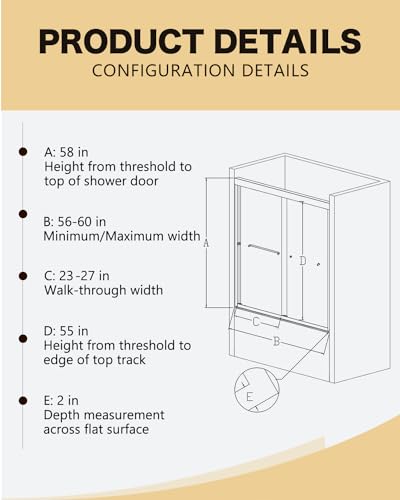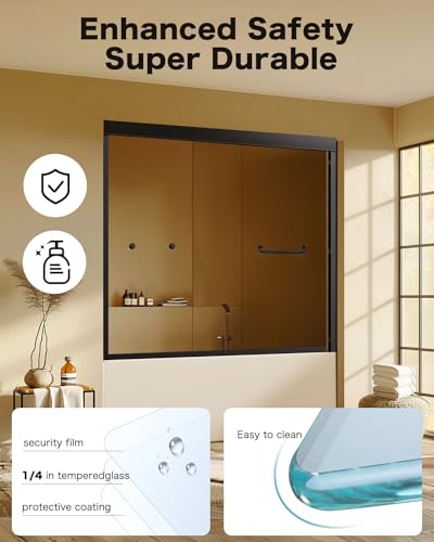 Adjustable Double Bypass Sliding Design: Semi-frameless bathtub door easily adjusts from 56 to 60 inches in width, optimizing bathroom space with a double sliding door system for smooth, space-efficient access. Features a lightweight and flexible design for long mechanical life and effortless opening and closing.