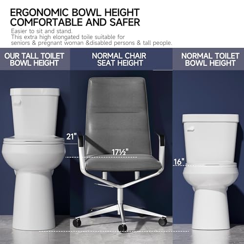 ?????21" Bowl Height Elongated Toilet?Miuara 21 inch tall toilet offers increased comfort and accessibility compared to standard-height toilets. The high toilet makes it easier for seniors, tall individuals, and those with mobility issues to sit down and stand up comfortably. Additionally, the comfort height bathroom toilet reduces strain on the knees and back, providing a more pleasant experience?