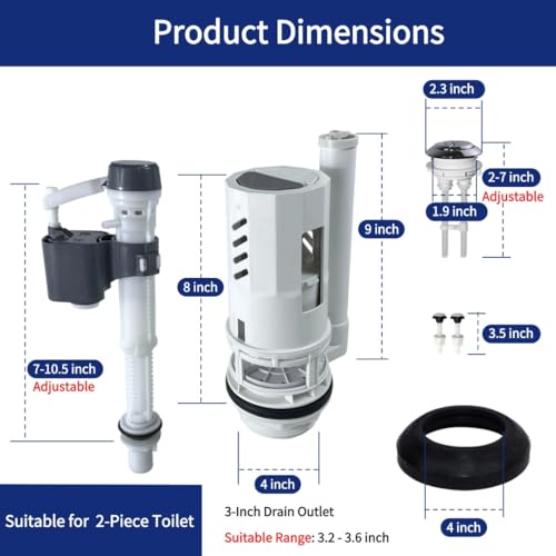 2-Piece Toilet Tank Replacement Kit :Includes a 3-inch diameter drain valve (fits standard 3.2"-3.6" drain outlet, 10"-13" Tank Height),a fill valve(7"-10.5" height-adjustable) and 1.9" threaded button(2"-7" length adjustment).Please check our size-measurement guide in the images before ordering