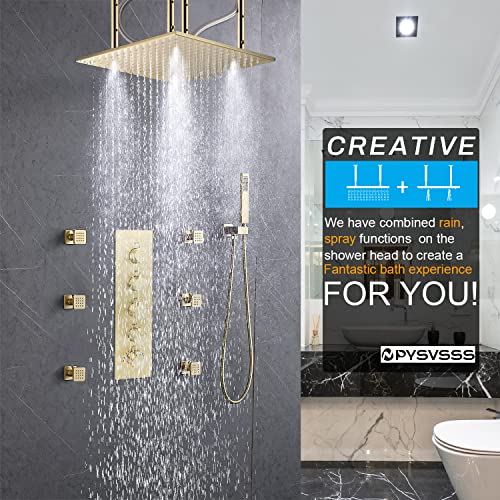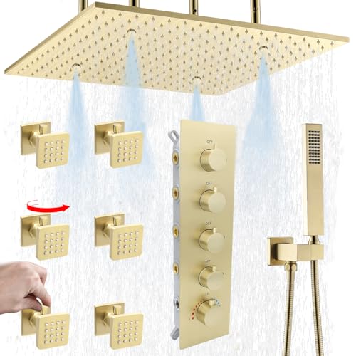 ?Two Shower Modes Overhead Shower?The improved 16-inch ceiling shower has two shower modes: mist mode and rainfall shower mode, which you can switch between according to your personal preference, or turn on both modes at the same time. There are three certain distances that can be adjusted (16inch; 13inch; 10inch) between the rain shower head and the ceiling. You can adjust the appropriate length according to your needs;
