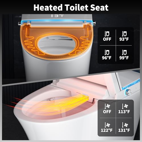 COMFORT SEAT,ADA HEIGHT:As a standout among smart toilets with bidet built in, ADA?compliant chair?height bowl makes sitting down and standing up easier for adults and seniors, easing knee and back strain. Heated seat offers 4 levels—Off / 93°F / 99°F / 104°F—so winter mornings aren’t a shock to your legs. LED display shows water temp, seat temp, and mode at a glance.
