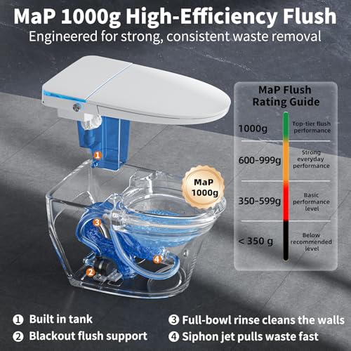 BUILT?IN TANK & POWER FLUSH:This Modern toilet delivers a powerful 1,000 g MaP flush for reliable waste removal. Built?in tank keeps flushing strong and stable even when home water pressure is low or fluctuates. Internal battery box lets you finish basic flushing during outages, and the auto lid opens as you approach, then auto?flushes and soft?closes after you stand—less bending, fewer touch points. Adjustable sensor range keeps response precise in tighter bathrooms.