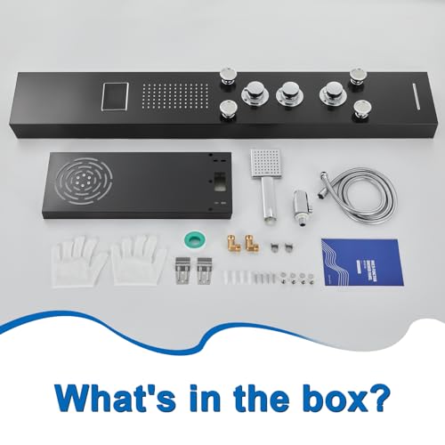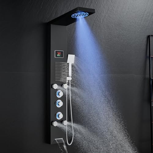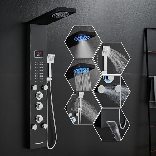 ?LED Shower Panel?The LED shower head and the digital temperature display are all powered by water flow, no batteries needed and more eco-friendly! The temperature display not only shows the current shower temperature to prevent kids from being scalded, but also shows how long you have been showering to save money and energy.