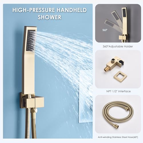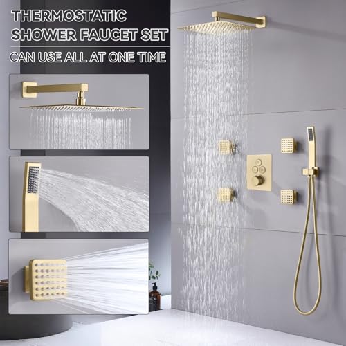 Premium Material- Thermostatic Shower Valve (Brass), 12-inch Square Rain Shower Head (304 stainless steel), Handheld Shower Head (Brass), 4 PCS Body Jets (Brass), Shower Arm (Brass), Shower Holder (Brass), 60-inch Shower Hose (304 stainless steel