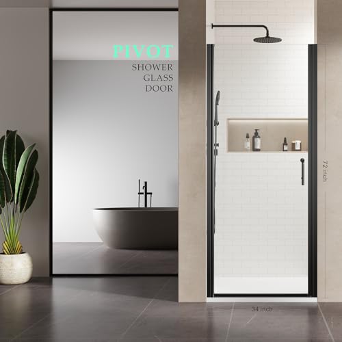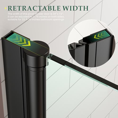 ADJUSTMENT WIDTH: The size of this pivot shower door is 34''x 72'',it can be adjusted by 0.75 inches on both sides,suitable for 33.5-35 inches wide bathroom openings (all measurements must be taken after wall finishes are completed).The pivot can be raised slightly when opening the door and lowered slightly when closing to avoid rubbing against the floor,making opening and closing easier and safer.