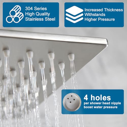 HIGH PRESSURE RAINFALL SHOWER?Utilizing cutting-edge air injection technology, this rainfall shower head blends water with air, doubling the pressure for a natural rain simulation. The reinforced panel, more than doubled in thickness, ensures durability under increased water pressure. Not only does it deliver outstanding longevity, but it also conserves water by up to 30%-50%, making it ideal for households with low water pressure seeking a high-pressure shower experience.