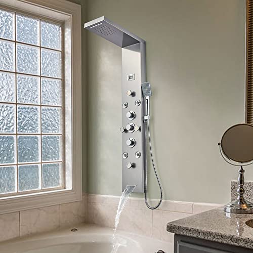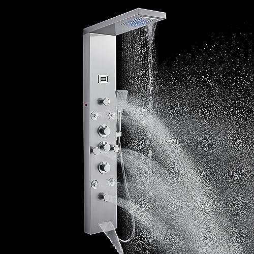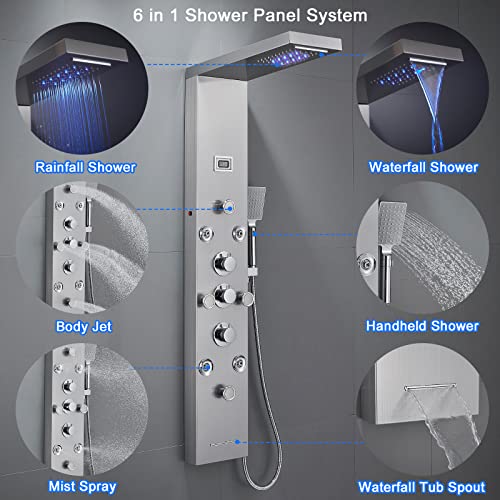 ?Multi Function Shower Panel?This 6-in-1 shower panel includes an array of features that will transform your daily shower routine. The built-in temperature display allows you to easily monitor the water temperature, while the LED rainfall and waterfall overhead shower create a romantic and soothing atmosphere in your bathroom. With 4 adjustable body shower massage nozzles and 4 adjustable mist sprayers, you can enjoy a powerful and invigorating shower experience. The tub spout provides convenien