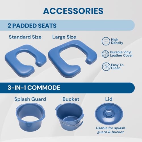 MULTI-PURPOSE USE: Easily portable between home and healthcare settings, this versatile design serves as a toilet seat raiser, bedside commode, or shower chair bathtub lifts, adapting to various user needs since 3 in 1 commode set is included