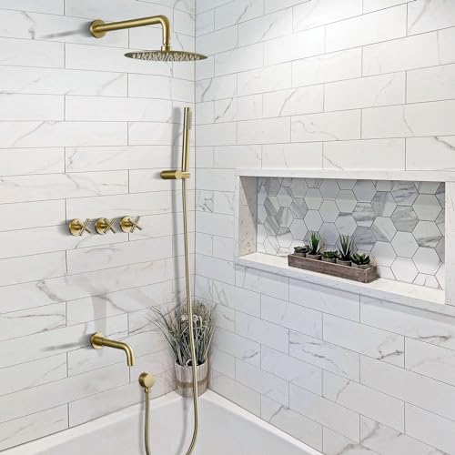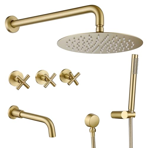3-Functional Design: 10 inch high pressure rain shower head for full body shower, handheld sprayer with 59 inch hose for bathroom or pets washing or shower when you don’t want to get hair wet, and 7 1/2 inch tub spout for filling an bathtub, this multi function brushed gold shower system with tub spout and handheld meets all your shower needs.