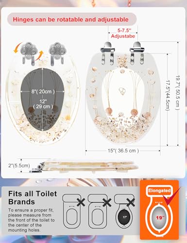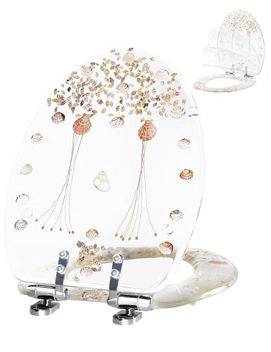 CLEAR SEASHELLS: Elongated resin toilet seat cover features clear shells over acrylic seat design that helps enhance the look of your bathroom and is the addition to your beach or coastal bathroom décor