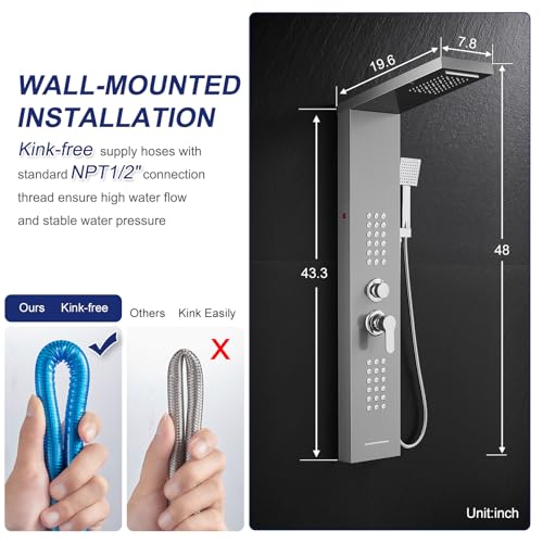 ?Solid Shower Tower?The shower panel is made of strong stainless steel, built to last; The valve body and diverter are made of brass to ensure longevity. The brushed stainless steel finish not only adds style but also ensures resistance to corrosion and tarnishing, keeping the shower panel looking new for years to come. All-in-one shower tower with standard NPT 1/2 hot and cold water line connection for easier installation