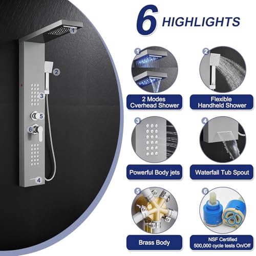 ?Versatile Shower Panel?Say goodbye to single shower mode! This 5-function LED shower panel tower system has built-in LED rainfall and waterfall showerhead, high-powered massage jets, handheld shower wand and waterfall tub spout. Choose the best shower mode you love. All functions work independently to ensure proper water pressure
