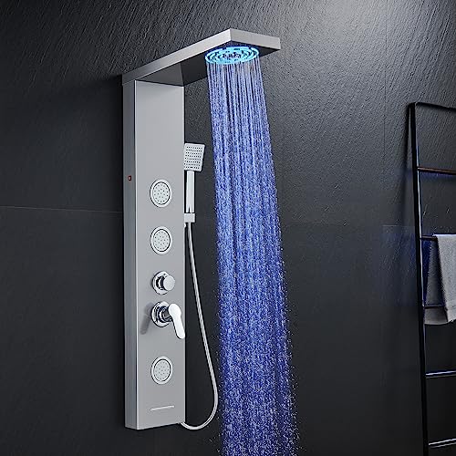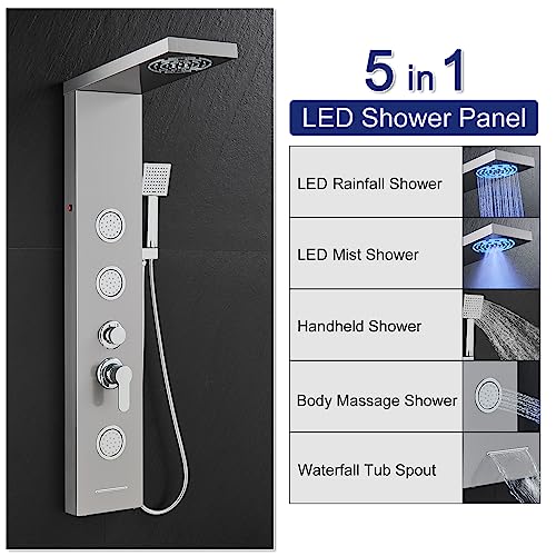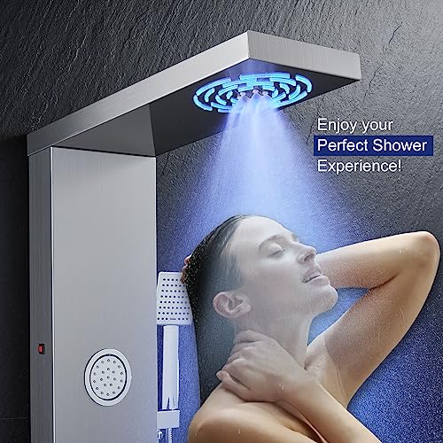 ?Versatile Shower Options? Say goodbye to single shower mode! This LED shower panel tower system offers a variety of shower options to suit your preferences, built-in LED rainfall and mist showerhead, high-powered massage jets, handheld shower wand and waterfall tub spout. Choose the best shower mode you love. This elegant shower panel in modern brushed surface is also an eye-catcher in your bathroom