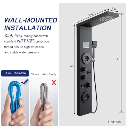 ?Sturdy and Long-lasting?The shower panel is made of strong stainless steel, built to last; The matte black surface not only adds style but also ensures resistance to corrosion and tarnishing, keeping the shower panel looking new for years to come. All-in-one LED shower tower with standard NPT 1/2 hot and cold water line connection for easier installation