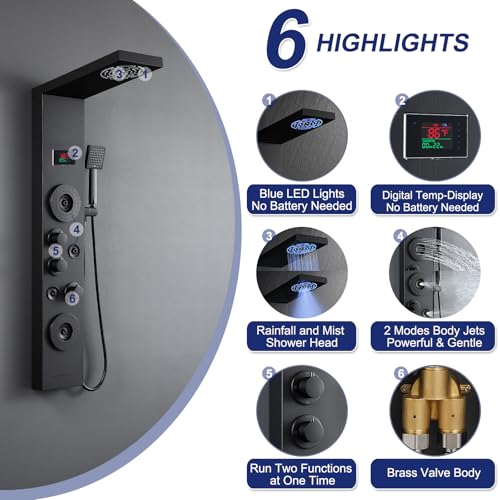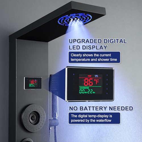 ?The Ultimate Shower Panel Experience?Say goodbye to single shower system! Choose the best shower mode you love. This elegant matte black LED shower panel system offers a variety of updraded shower options to suit your preferences: ? LED rainfall showerhead for a spa-like immersion; ? Misting showerhead for rejuvenating sensation; ? 4 angle adjustable body mist sprays and 2 big round body jets for targeted relaxation; ? A convenient handheld matching with 150cm hose for ultimate flexibility; ? Digital display for showing the shower time and temperature(No battery required, save money and time); ? You can run 2 functions simultaneously