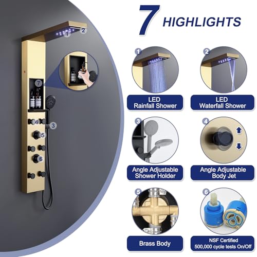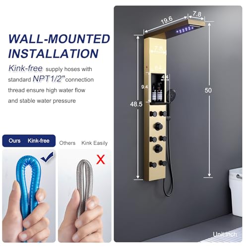?The Ultimate Shower Panel Experience? Leave outdated single shower system behind. Elevate your routine with ROVATE's versatile shower panel. This elegant, brushed gold shower panel presents a range of luxurious features: ? Rainfall waterfall showerhead for a spa-like immersion; ? Angle adaptable body massage sprays for targeted relaxation; ? A 5-function handheld showerhead for ultimate flexibility; ? A built-in shower niche for additional storage space; ? Handheld shower is equipped with SELF-CLEANING technology, preventing clogs and ensuring enduring performance
