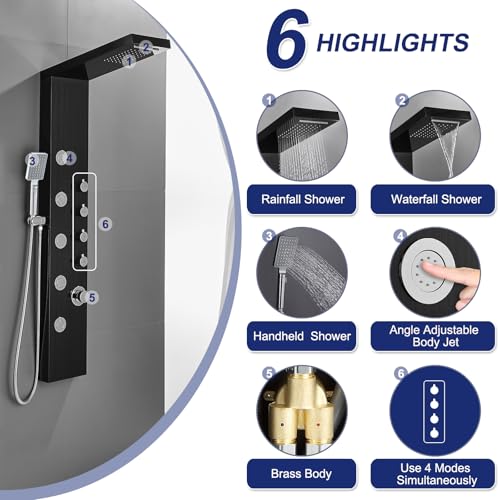 ?Multi-Function Shower Panel?This 4-in-1 elegant shower panel in modern black is an eye-catcher in every bathroom. With a rainfall and waterfall overhead shower, 3-function hand shower and 5 body massage jets, the shower panel provides an unforgettable shower experience to relax and feel good. All functions can work independently and 4-mode shower also can be turned on at the same time