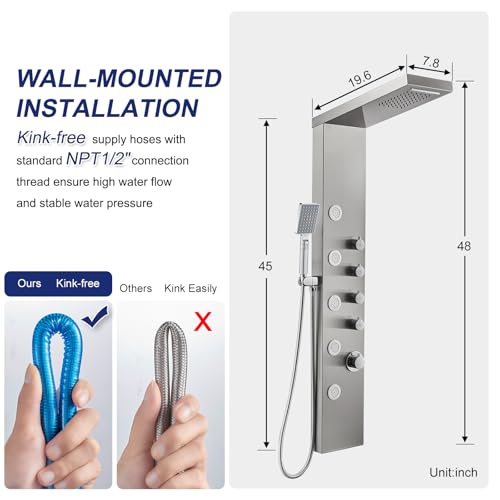 ?SUS 304 Stainless Steel Material?The shower panel is constructed of precision high-grade 304 stainless steel for durability and corrosion resistance, brass mixing valve and shower diverter valve included. Creating a New Look for your bathroom, enjoy SPA at your home