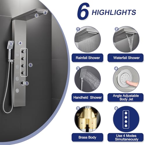 ?The Only Shower Panel You Need?Say goodbye to your old shower systems. The elegant shower panel is an eye-catcher in every bathroom. With a rainfall and waterfall overhead shower, handheld shower and 5 body massage jets, the shower panel provides an unforgettable shower experience to relax and feel good. All functions work independently and 4-mode shower can be turned on at the same time