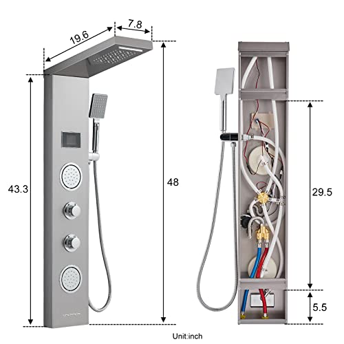 ?Upgraded Shower Tower?This Shower Panel System has built-in Romantic LED lights and temperature display which are powered by waterflow, no battery required. The digital temperature display clearly shows the current temperature and the lasting time of shower