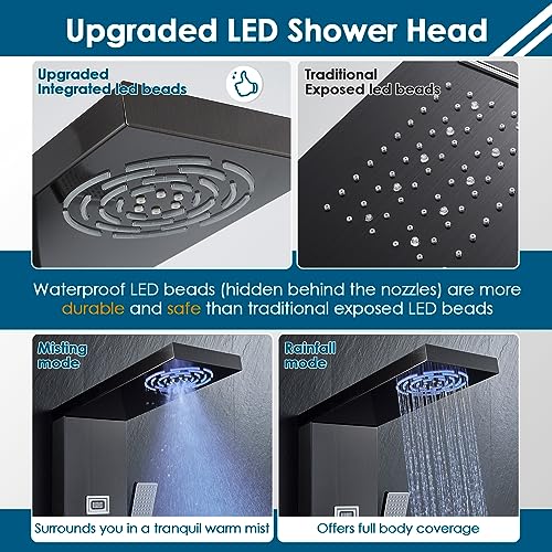 Mist and Rainfall Mode: This shower panel features a 2-in-1 shower head that lets you choose how you want to pamper yourself. 1) Mist mode envelops you in a gentle mist that relaxes your mind and body. 2) Rainfall mode delivers a powerful spray that covers your whole body, making it easy to wash away dirt and stress. Whether you want to unwind or energize, this shower tower has you covered